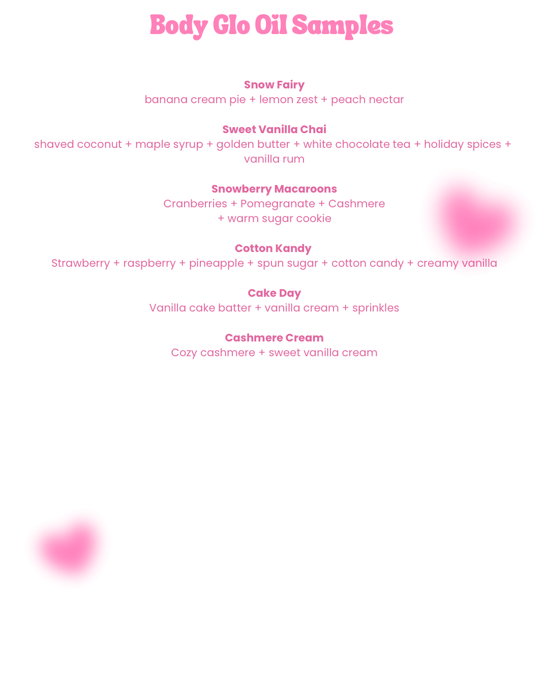 Body Glo Oil: Grape seed Oil, Avocado Oil, Jojoba Oil, Coconut Oil, Vitamin E Oil, Fragrance